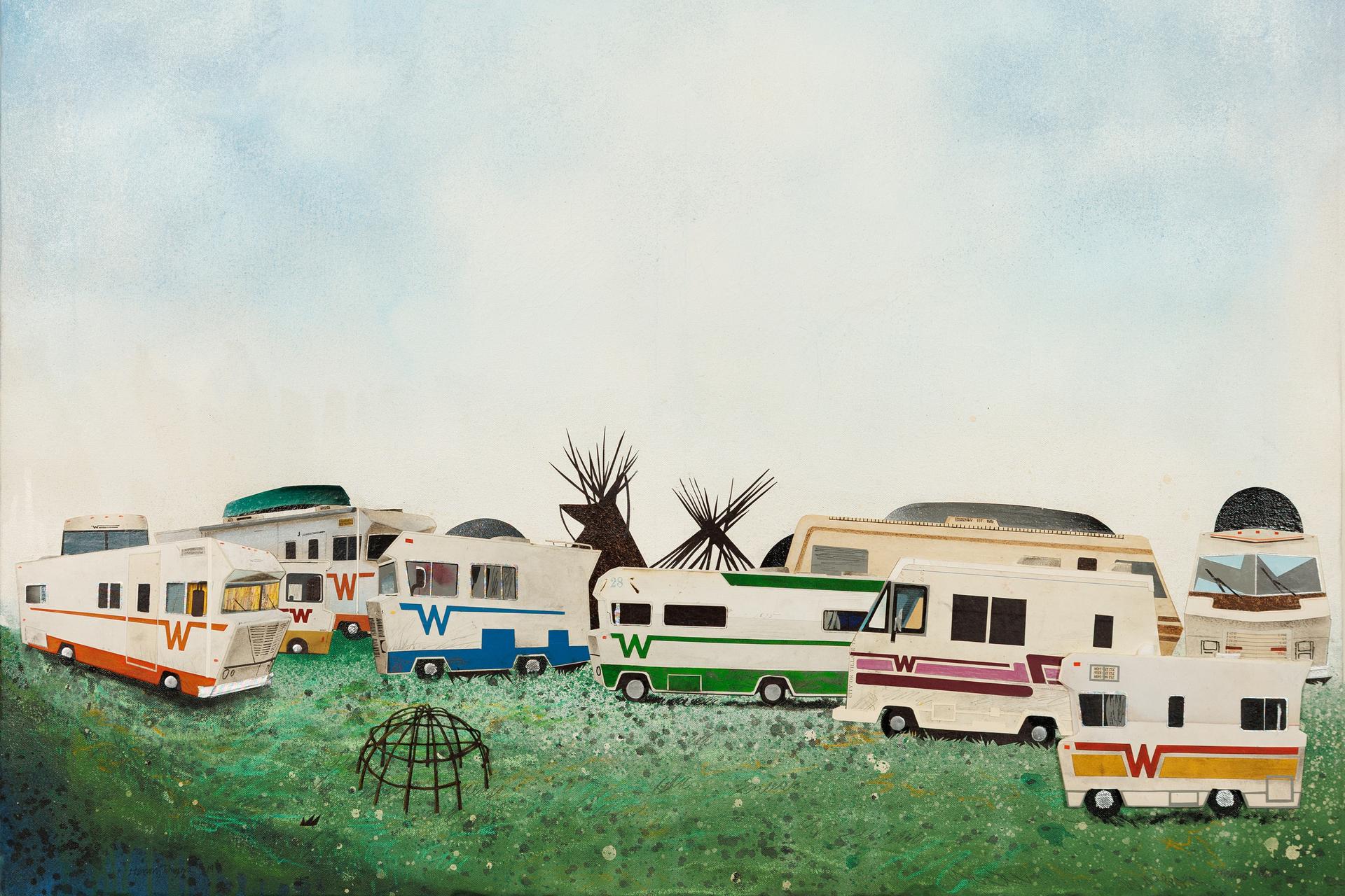 Detail from Henry Payer's "Winnebago Camp," a multimedia painting from 2019. (Courtesy of the artist) |