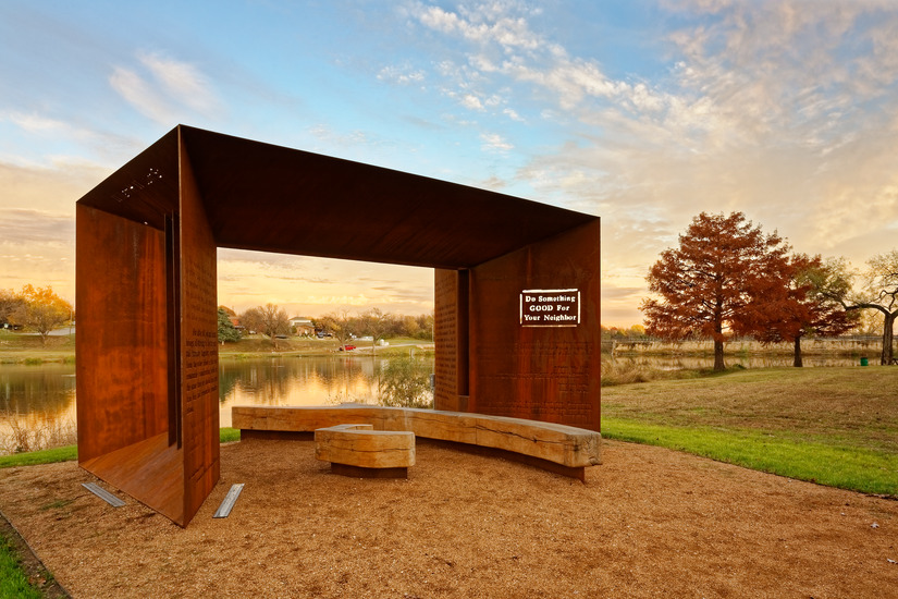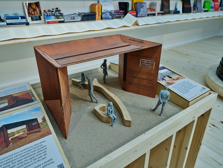 The Venice display is a 12:1 scale model (pictured) of the original project in Texas, where carved wooden benches sit below a weathering steel archway engraved with quotes from local interviews about the surrounding neighborhood. It’s inspired by Fort Worth’s ecology, architecture and local history, and it connects the city’s past and present. |