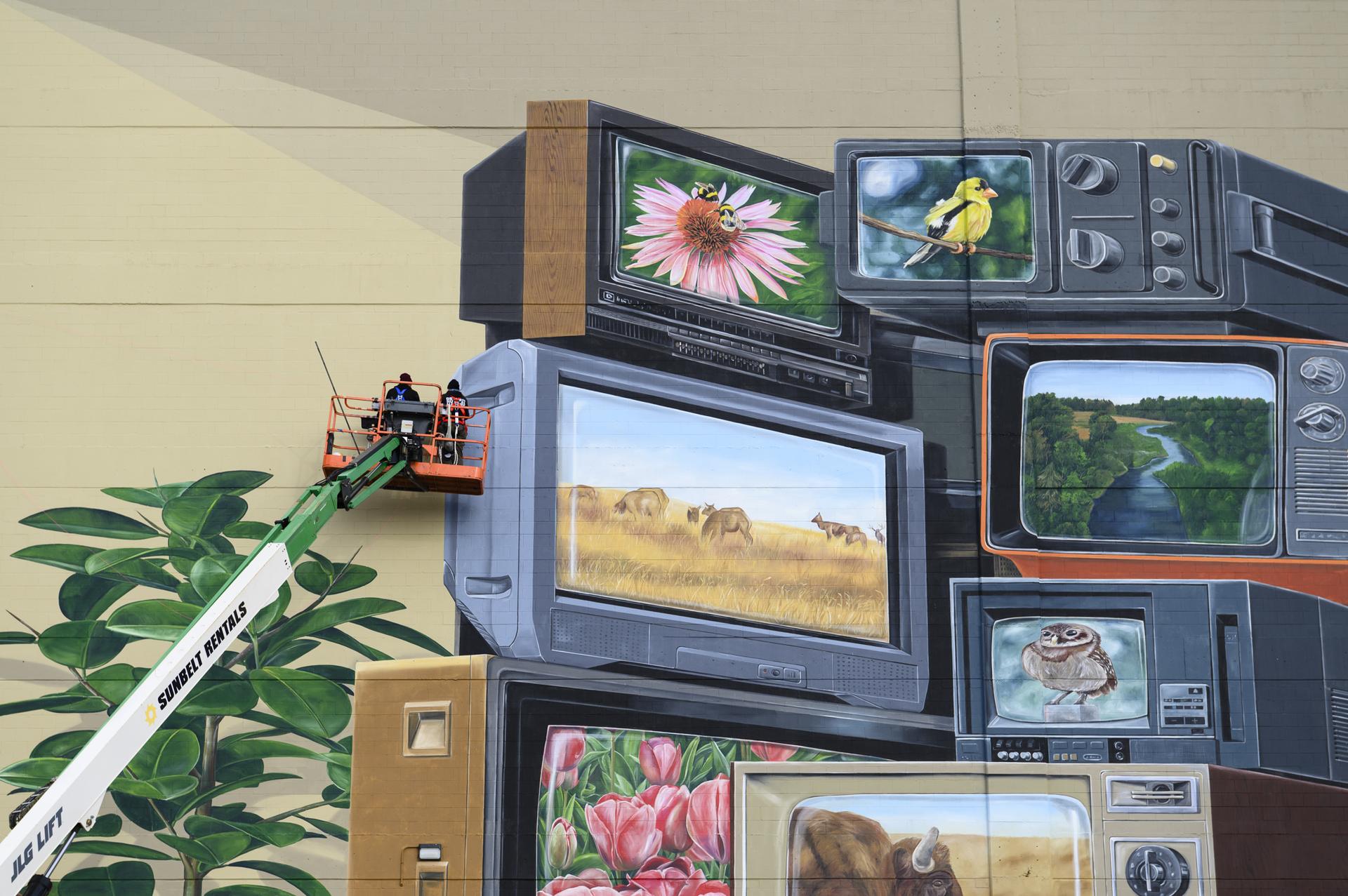 The AR feature animates the images on the wall. App users will notice the television screens come to life: the bison roams, the eagle soars, the elk meander through the prairie. As viewers move toward the left side of the mural, the AR animation reveals a lush aerial image on the top-right television, which is hidden in the actual painting.