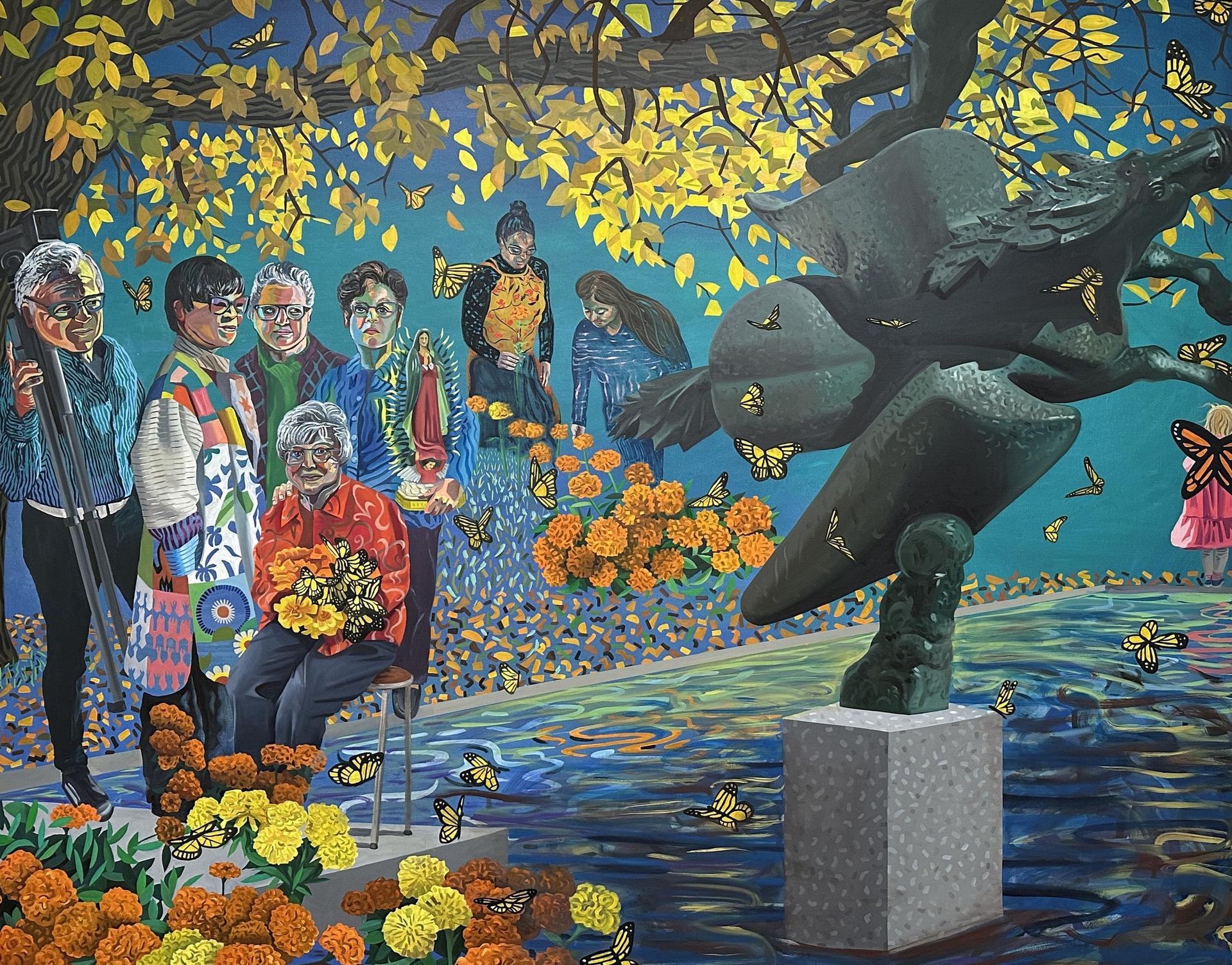 Aliza Nisenbaum's new painting "Butterfly, Cempasuchil, and Pegasus in Flight, Day of the Dead Committee Members" features locals who helped organize the Día de los Muertos tradition at the Des Moines Art Center. (Image: Des Moines Art Center) |